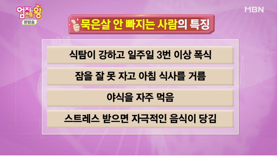 엄지의 제왕 331회에서는 '묵은살'의 정체에 대해 알아보고 묵은살을 빼는 방법들을 공개했습니다. 잘 빠지지 않고 몸에 차곡차곡 쌓여서 가장 늦게 빠지는살 묵은살 다이어트 자세히 알아볼게요.