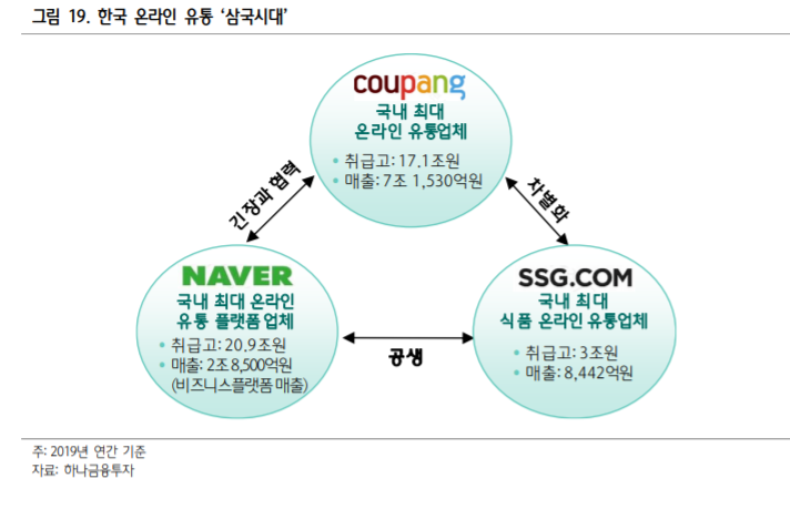 국내 최대 식품 유통업체인 이마트는 네이버와 쿠팡이 시장에 침입해오는 와중에 식품 시장의 주도권을 확보하였습니다. 대형 오프라인 업체인 롯데마트, 홈플러스와는 다르게 사업구조를 발 빠르게 탈바꿈하여 안주하지 않고 혁신하고 있다는 평을 받고 있습니다. 세계적인 유통의 3대 흐름 노브랜드/창고형 대형마트(트레이더스)/ 식품 온라인(이마트몰)을 실천하면서 좋은 실적도 내고 있습니다. 노브랜드 점포수는 270개로 흑자 전환하였습니다. 이마트는 2012년 CA저장고/후레쉬센터 등 초기부터 인프라 투자를 꾸준히 해왔기 때문에 온라인 식품시장의 주도권을 가지고 있습니다.